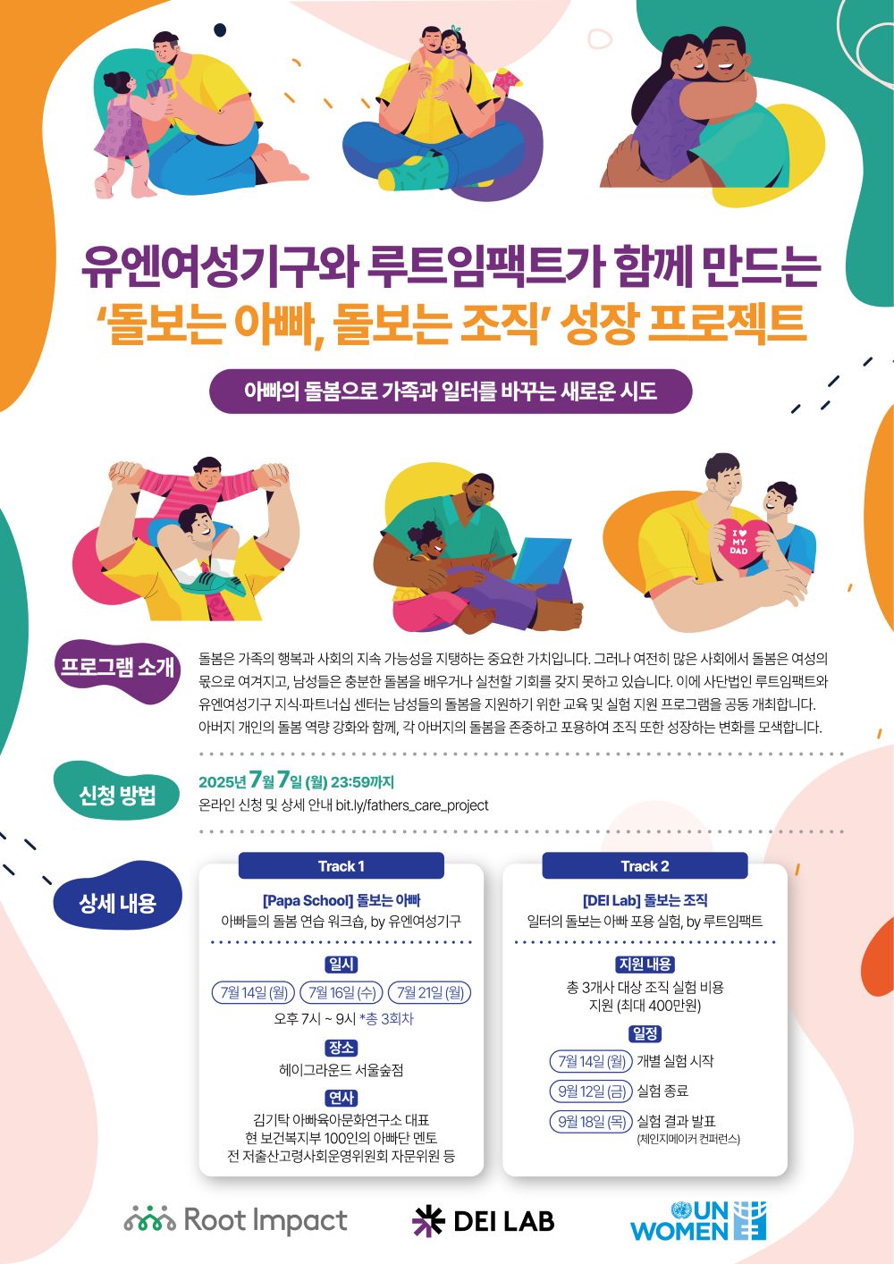 루트임팩트(사단법인)와 유엔여성기구(UN Women) 지식·파트너십센터가 ‘돌보는 아빠, 돌보는 조직’ 성장 프로젝트 참여 기업을 2025년 7월 7일(월)까지 모집한다. 본 프로젝트는 남성 돌봄 역량 강화와 조직 내 돌봄 문화 혁신을 위한 교육 워크숍, 조직 실험, 맞춤형 지원을 제공한다. 기업 내 남성 근로자(특히 아버지)와 조직 리더가 함께 참여할 수 있다[1][2][3]。