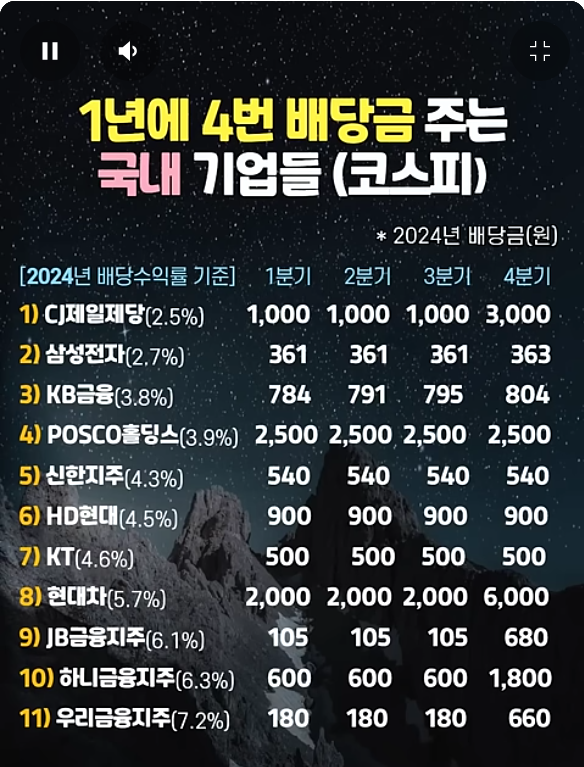 아래는 연 4회 배당 또는 분기배당을 실시하거나 최근에 도입한 대표 코스피 기업들입니다. (자료는 최신 공시 + 배당 정보 기반, 정책 변화 가능성 있음.)