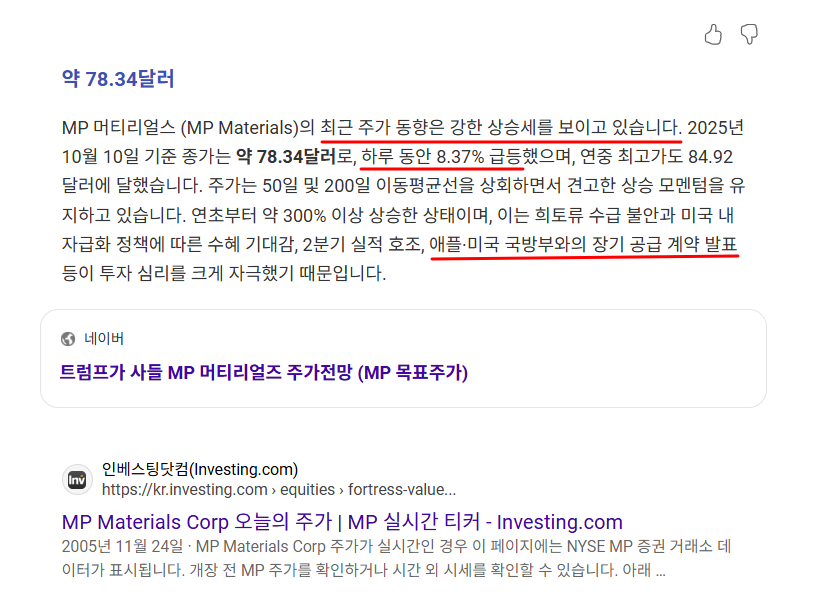 - ✔ 미 국방부가 MP 머티리얼즈(MP Materials)에 지분성 자금 투입