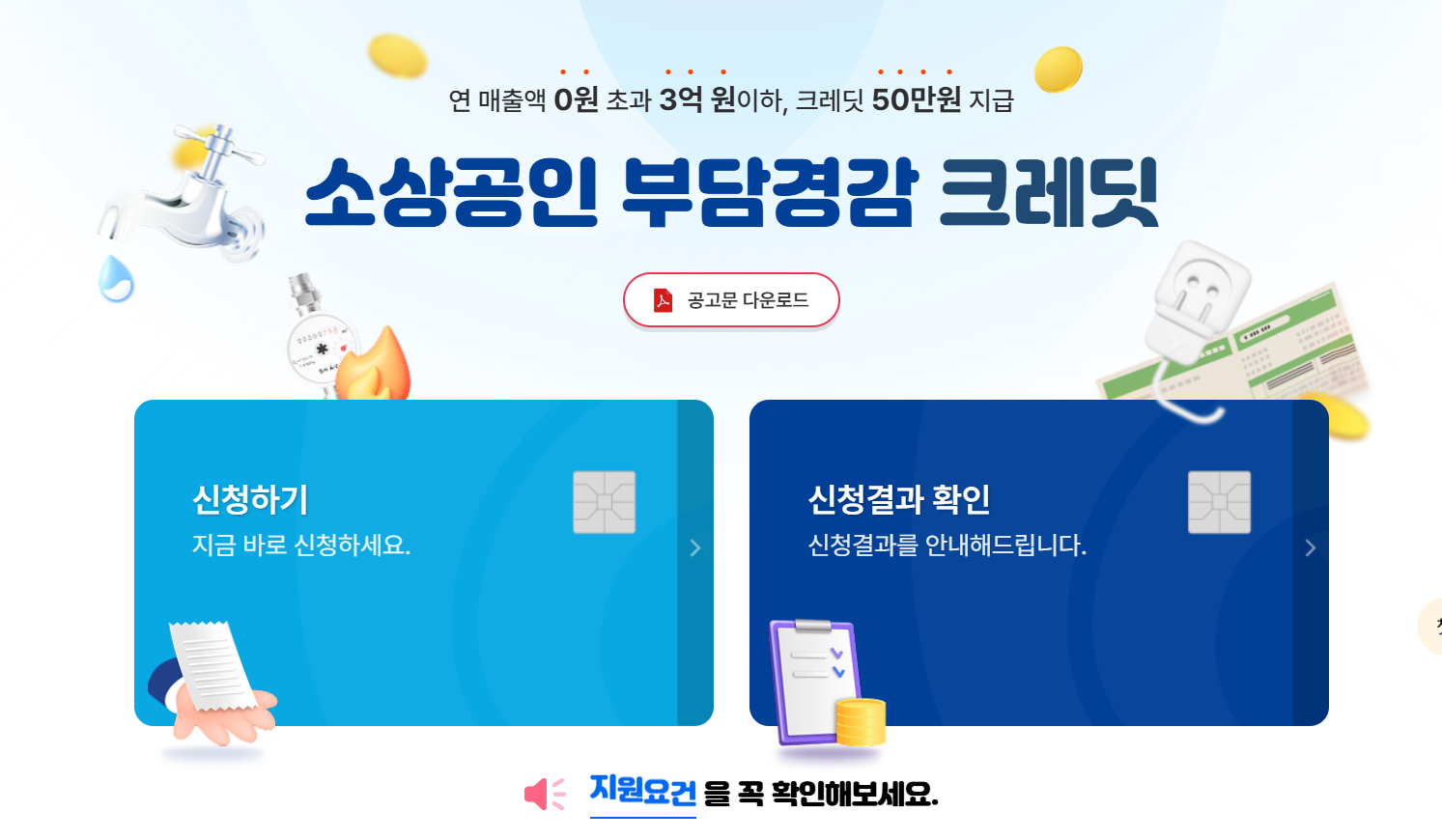 “소상공인 부담경감 크레딧”은 연매출 3억원 이하 소상공인을 대상으로 공과금(전기·가스·수도) 및 4대 보험료(국민연금·건강보험·고용보험·산재보험) 납부에 사용할 수 있도록 최대 50만원 포인트(크레딧)을 카드에 지급하는 정부 지원 제도입니다.