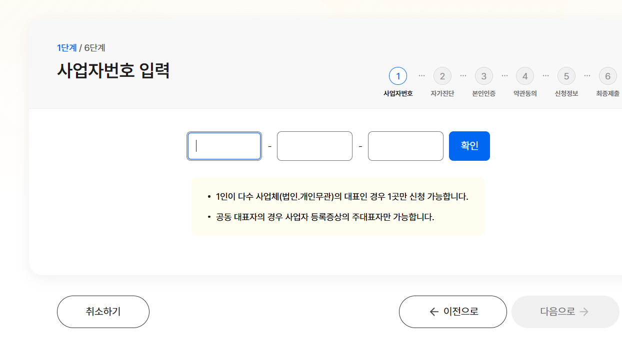 - 본인 인증·자격 확인 : 사업자번호·개업일·매출 자동 조회