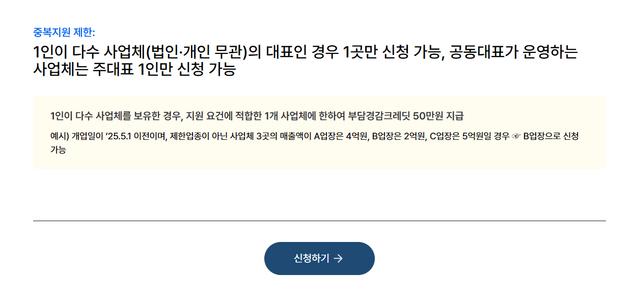 A: 사업자등록증이 있어야 하며, 등록된 개인·법인사업자만 신청 가능합니다. - Q: 중복 수혜 가능할까요?