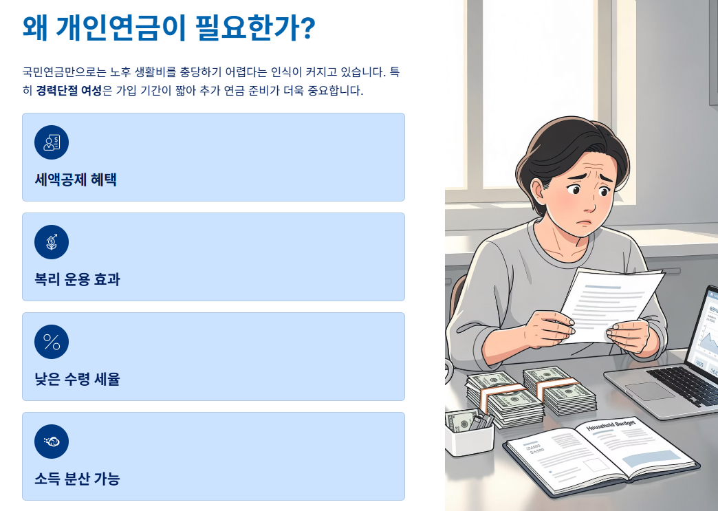 특히 40~60대 여성이라면 지금부터라도 개인연금 전략을 점검하는 것이 필요합니다.