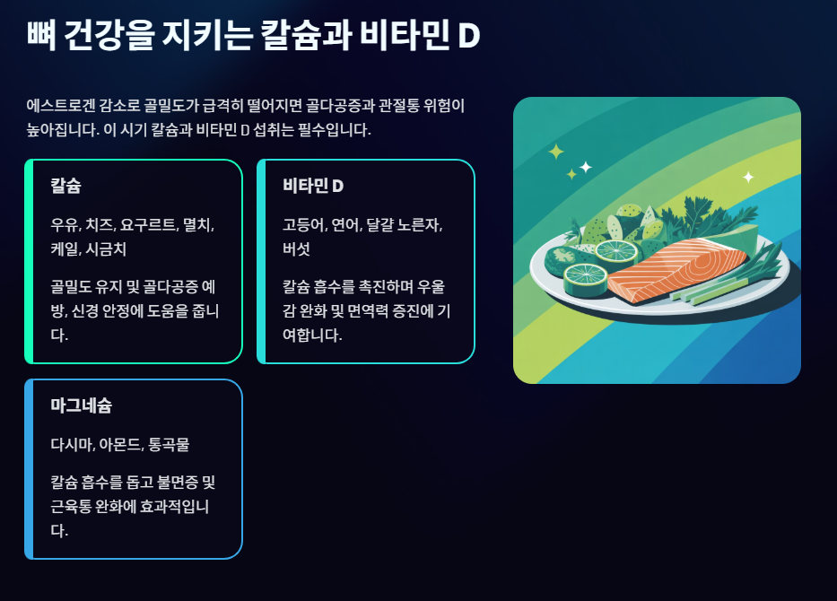 에스트로겐이 감소하면 골밀도가 급격히 떨어져 골다공증과 관절통 위험이 높아집니다. 이 시기에는 칼슘과 비타민 D 섭취가 필수입니다.