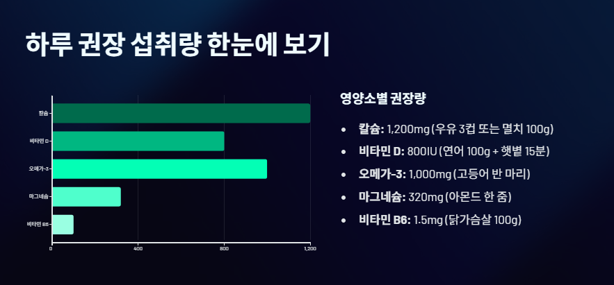 | 칼슘 (Calcium) | 우유, 치즈, 요구르트, 뼈째 먹는 생선(멸치, 뱅어포), 케일, 시금치 | 골밀도 유지 및 골다공증 예방, 신경 안정. |