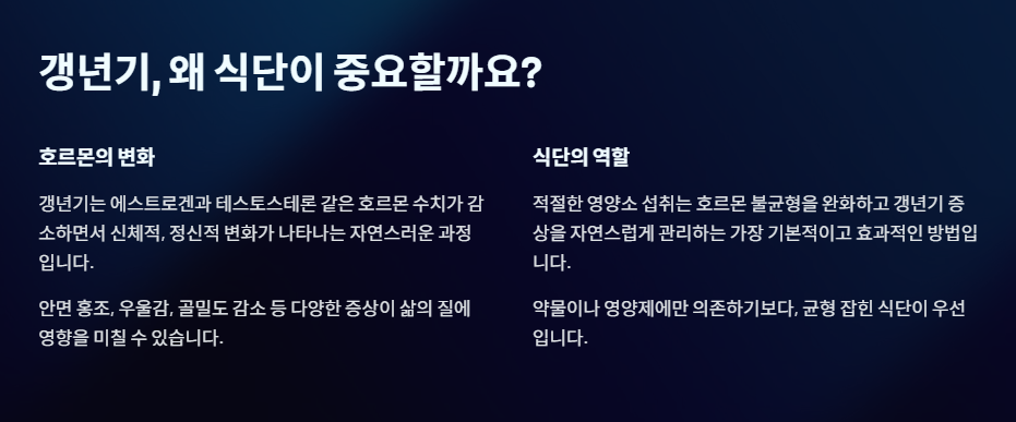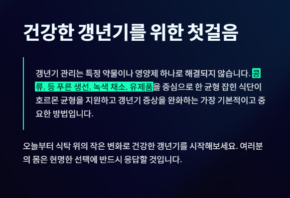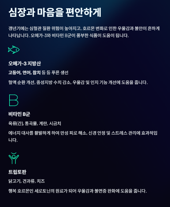| 영양소 | 대표 음식 | 갱년기 효능 |