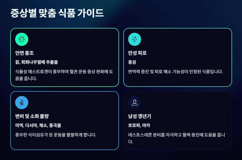 | 증상 | 추천 식품 및 성분 | 이유 |