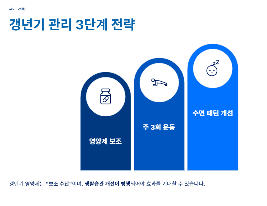 갱년기 영양제 추천은 “보조 수단”이며, 생활습관 개선이 병행되어야 효과를 기대할 수 있습니다.