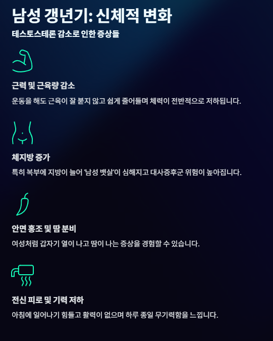 테스토스테론(남성호르몬)의 점진적인 감소로 인해 나타나며, 보통 40대 중반 이후부터 서서히 진행됩니다.