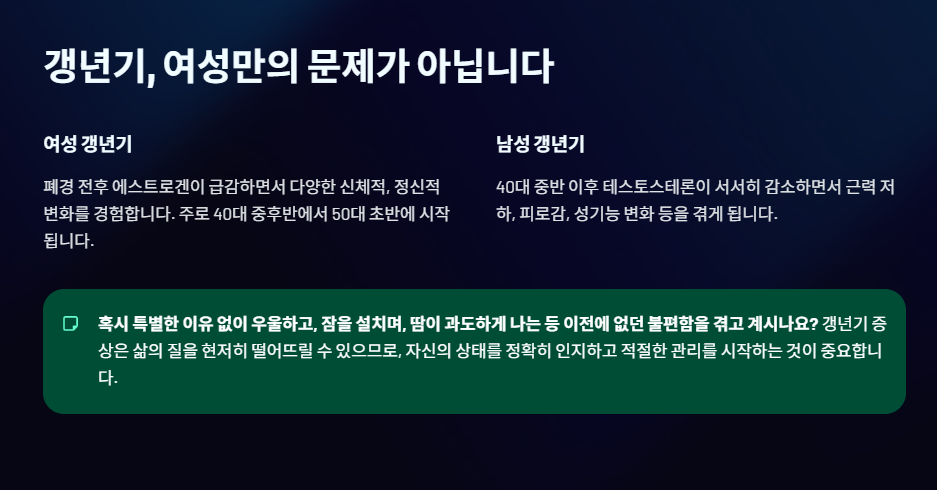 혹시 특별한 이유 없이 우울하고, 잠을 설치며, 땀이 과도하게 나는 등 이전에 없던 불편함을 겪고 계시진 않나요?