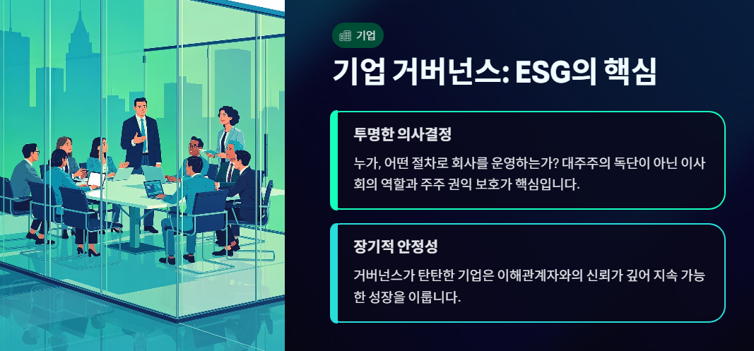 기업 거버넌스(Corporate Governance)는 "이 회사가 누구에 의해, 어떤 절차로 운영되는가?"를 묻는 것입니다. 단순히 돈을 많이 버는 것을 넘어, 대주주가 독단적으로 결정하지는 않는지, 이사회가 제 역할을 하는지, 주주들의 권익을 보호하는지 등 의사결정의 투명성과 공정성을 따지는 것이죠.