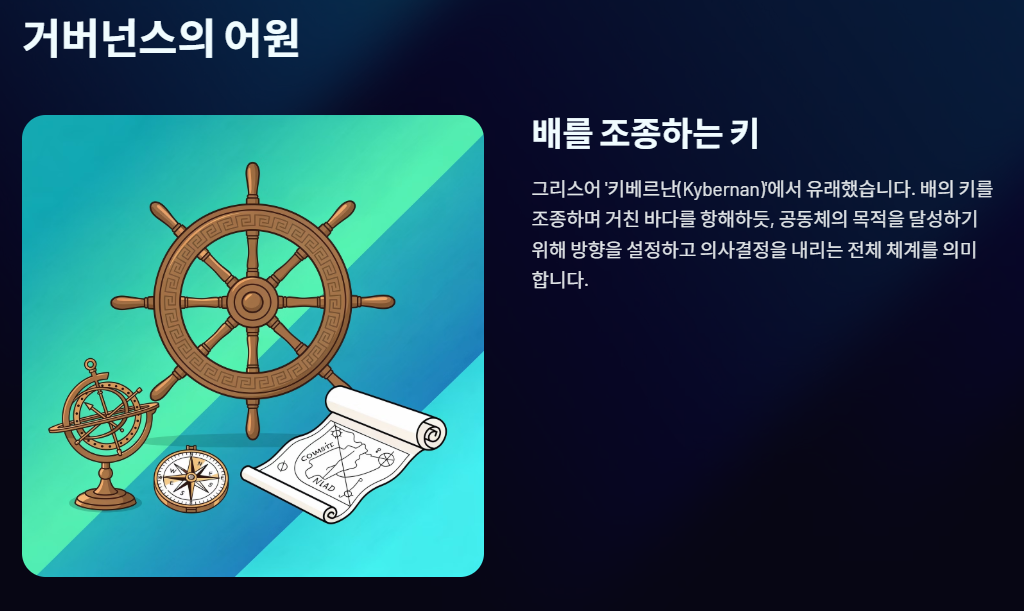 거버넌스의 어원은 그리스어 **'키베르난(Kybernan)'**에서 왔습니다. 이는 **'배의 키를 조종하다'**라는 뜻이에요. 거대한 배가 거친 바다를 항해할 때, 단순히 엔진만 돌리는 게 아니라 주변 상황을 살피고 방향을 잡으며 나아가는 전체적인 과정을 의미하죠. 즉, 공동체의 목적을 달성하기 위해 방향을 설정하고 의사결정을 내리는 '체계'를 말합니다.