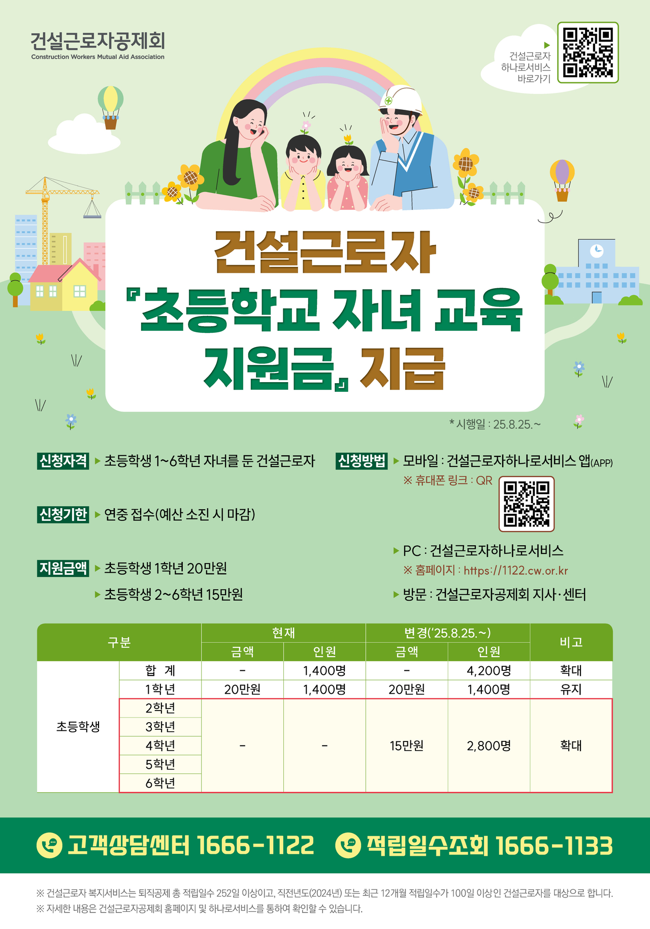 건설근로자공제회가 초등학생 자녀를 둔 근로자의 교육비 부담을 덜기 위해 초등학교 1학년 20만원, 초등학교 2~6학년 15만원을 지원합니다.