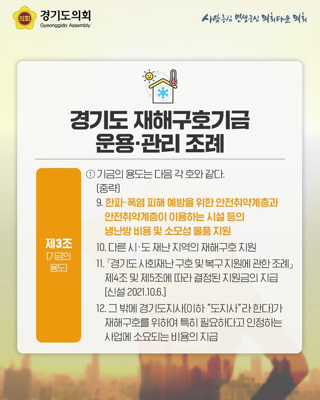 - 경기도 공식 보도자료 및 공지(재해구호기금 편성·냉방비 지원).