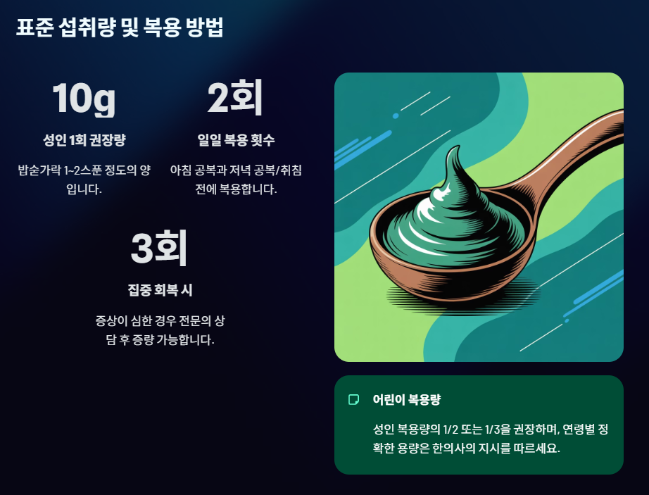• 어린이 복용량: 성인 복용량의 1/2 또는 1/3을 권장하며, 연령별 정확한 용량은 한의사의 지시에 따릅니다.