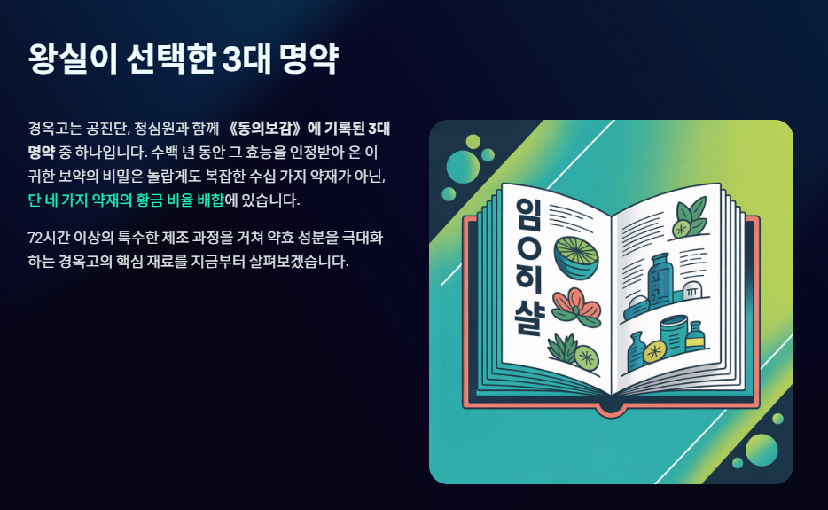 경옥고(瓊玉膏)는 공진단, 청심원과 더불어 《동의보감》에 기록된 3대 명약 중 하나로, 수백 년 동안 그 효능을 인정받아 왔습니다. 이 귀한 보약의 놀라운 효과는 복잡한 수십 가지 약재가 아닌, 단 네 가지 약재황금 비율 배합에서 나옵니다.