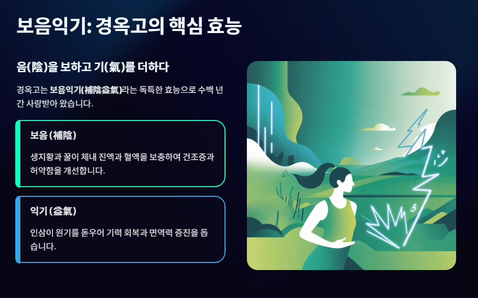 경옥고는 **생지황(음 보충)**과 **인삼(기 보강)**을 핵심으로, **복령(소화 안정)**과 **꿀(약성 조화)**을 더하여 **보음익기(補陰益氣)**의 효능을 극대화한 보약입니다. 이 네 가지 재료의 황금 비율과 72시간 중탕의 정성이 경옥고의 독보적인 회복력을 만 들어냅니다.