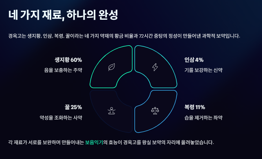 경옥고의 핵심은 이 네 가지 약재(생지황, 인삼, 복령, 꿀)를 특정한 비율로 혼합하고, 72시간 이상 **특수한 제조 과정(중탕)**을 거쳐 약효 성분을 극대화하는 데 있습니다.