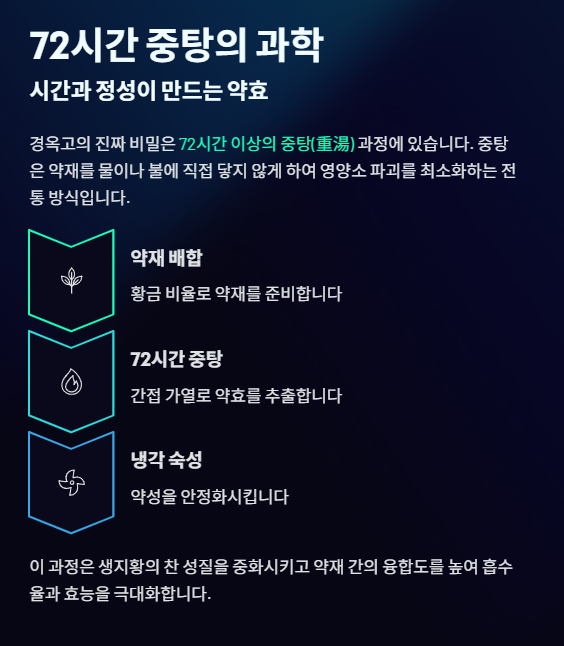 경옥고의 효능은 단순히 약재 배합에서 나오는 것이 아니라, 그 제조 과정에 있습니다. 《동의보감》에서는 약재를 72시간 이상 중탕(重湯)하고 다시 식히는 과정을 거치도록 명시하고 있습니다.