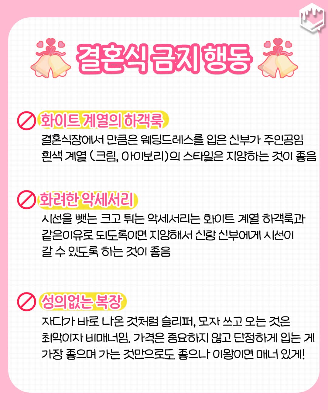 신부보다 더 화려한 옷차림, 흰색 드레스, 과한 액세서리는 절대 금지입니다. 남성은 정장 또는 깔끔한 자켓 착용이 기본 예절입니다.