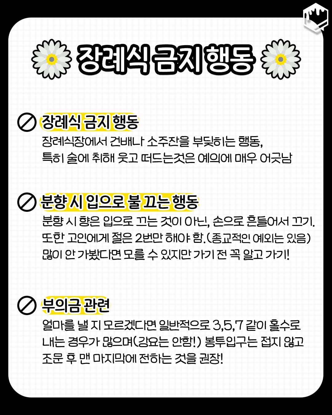 장례식은 고인을 추모하고 유가족의 슬픔을 위로하는 자리입니다. 그만큼 분위기와 행동 하나하나에 세심한 주의가 필요합니다.