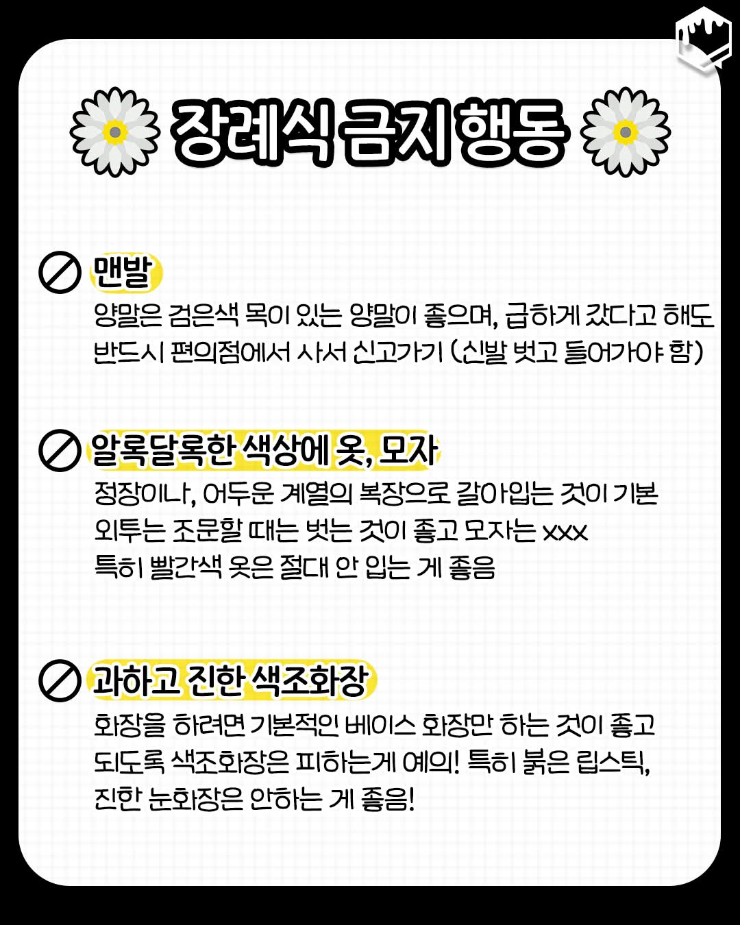 장례식은 고인을 추모하고 유가족의 슬픔을 위로하는 자리입니다. 그만큼 분위기와 행동 하나하나에 세심한 주의가 필요합니다.