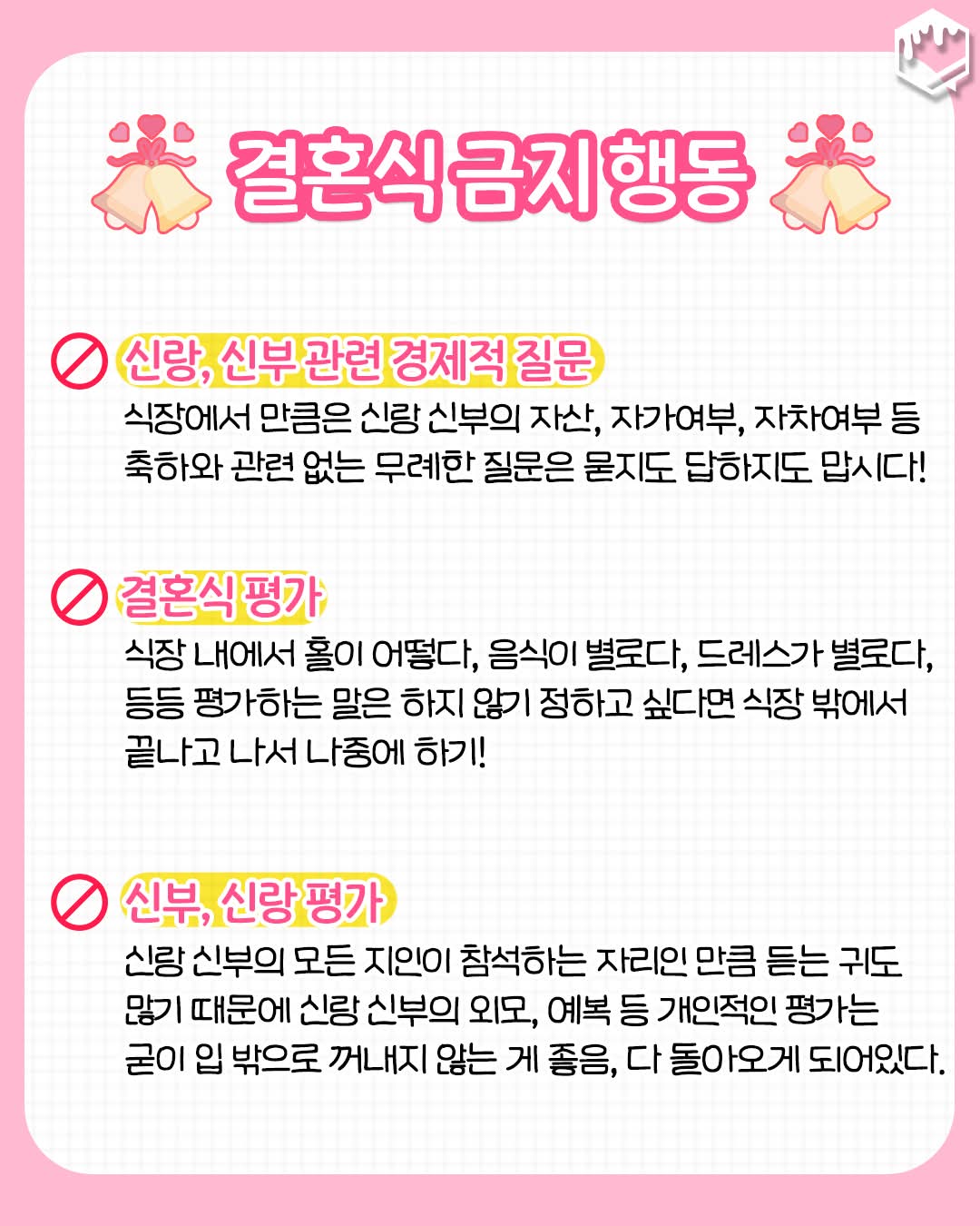 결혼식은 축하의 자리이지만, 동시에 격식을 갖춰야 하는 공식 행사입니다. “친하니까 괜찮겠지”라는 생각이 오히려 실수가 됩니다.