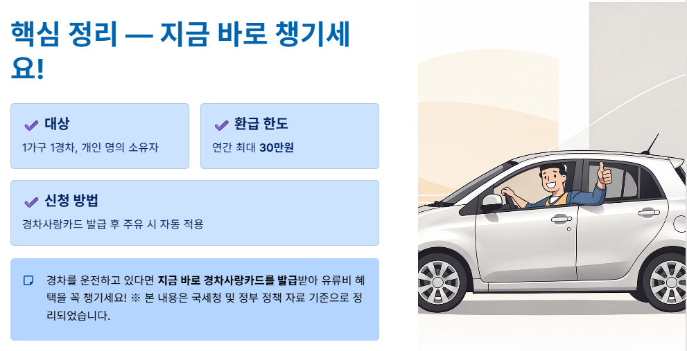 경차를 운전하면 유류세 환급을 받을 수 있다는 사실 알고 계셨나요? 많은 운전자들이 신청방법을 몰라 연간 최대 30만원 혜택을 놓치고 있습니다. 2026년 기준 경차 유류세 환급 신청방법과 카드