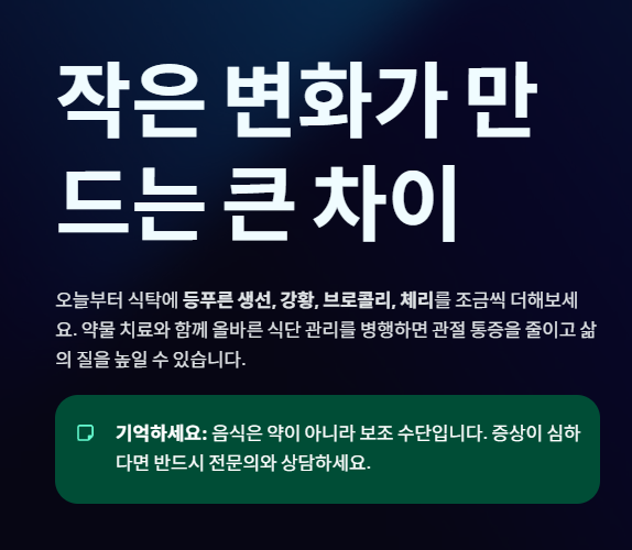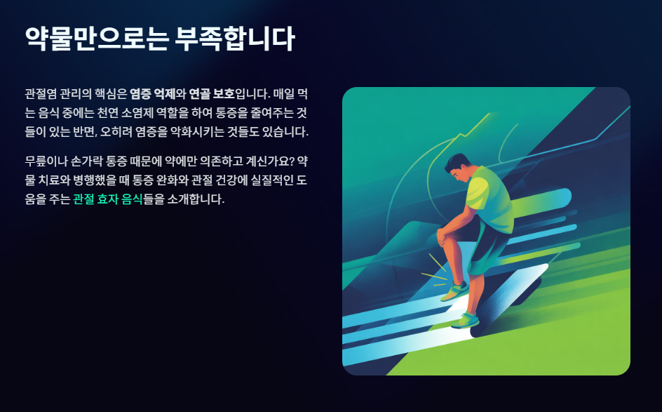 약물 치료와 병행했을 때 통증 완화와 관절 건강에 실질적인 도움을 주는 **'관절 효자 음식'**들을 영양 성분별로 정리해 드립니다.