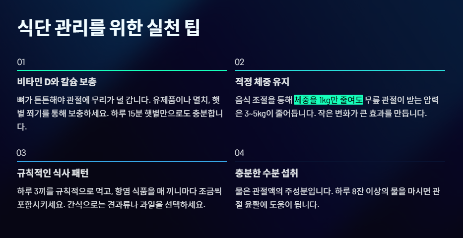- 비타민 D와 칼슘: 뼈가 튼튼해야 관절에 무리가 덜 갑니다. 유제품이나 멸치, 햇볕 쬐기를 통해 보충하세요.