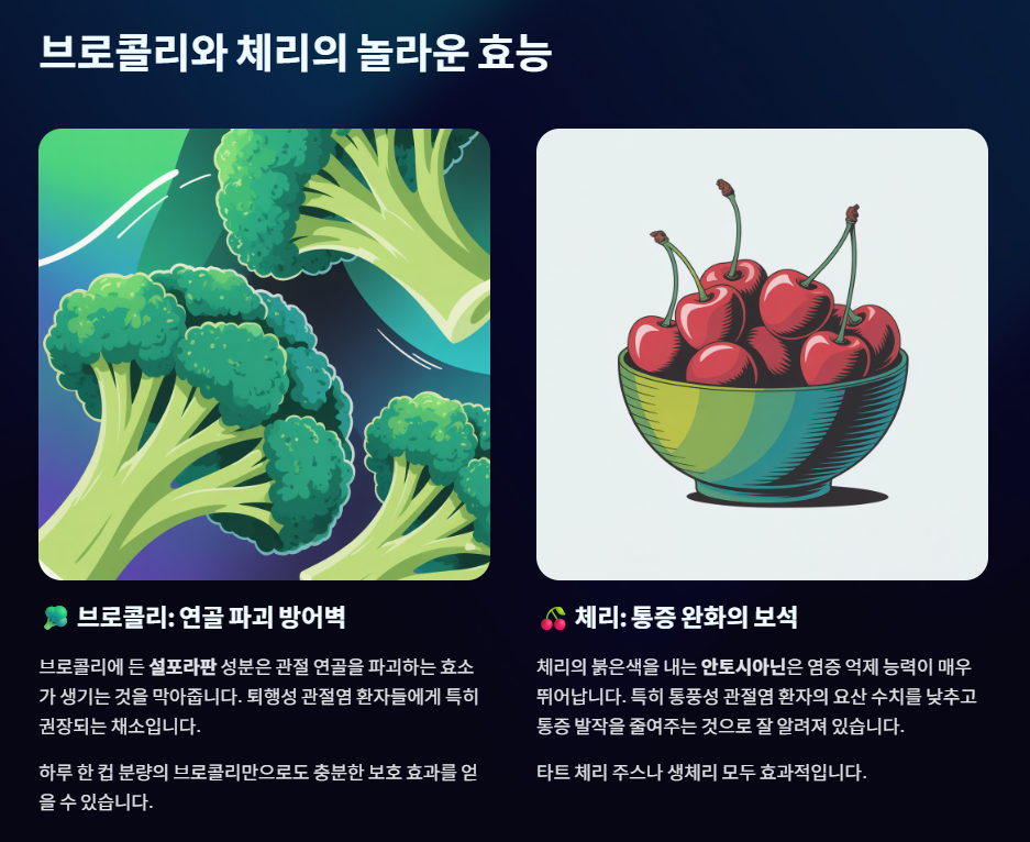 | 십자화과 채소 | 브로콜리, 양배추 | 설포라판 | 연골 파괴 효소 차단 및 관절 보호 |