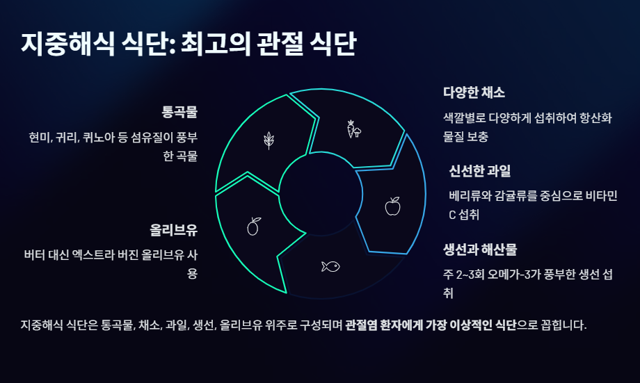 - 지중해식 식단: 통곡물, 채소, 과일, 생선, 올리브유 위주의 식단은 관절염 환자에게 가장 이상적인 식단으로 꼽힙니다.