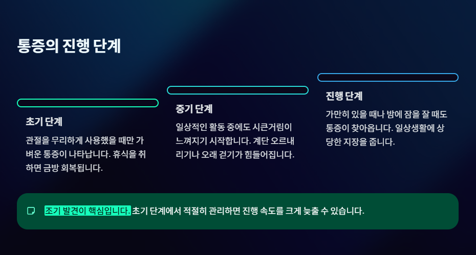통증 시점 관절을 많이 쓴 저녁에 심함 자고 일어난 아침에 가장 심함