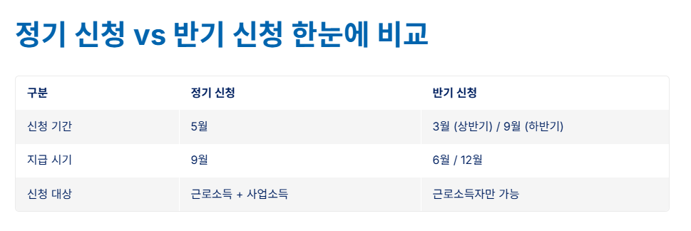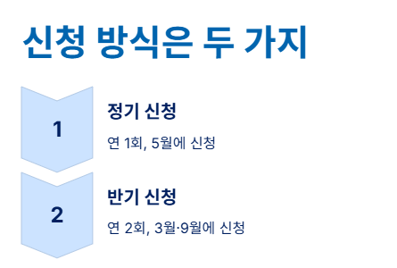 근로장려금 신청 방식은 크게 정기 신청과 반기 신청으로 나뉩니다.