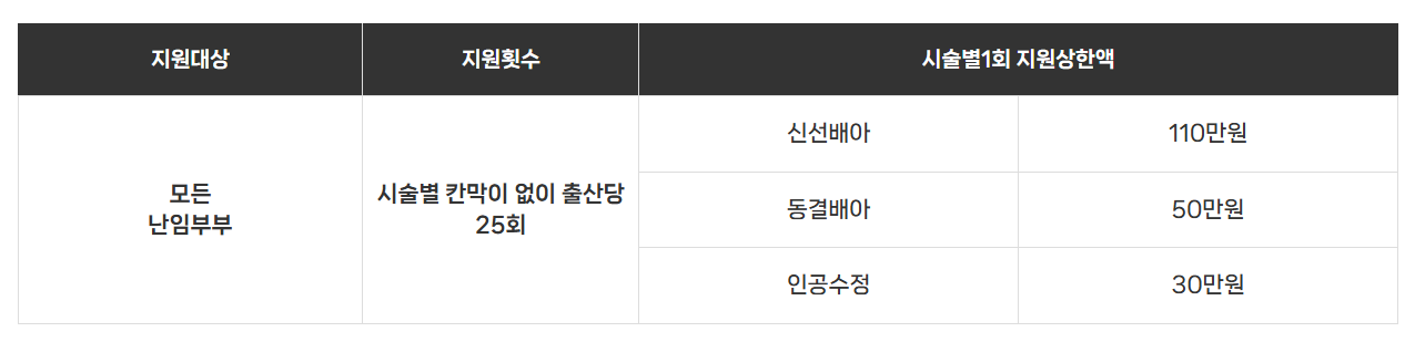 - 체외신선배아: 110만원 / 동결배아: 50만원 / 인공수정: 30만원 (출산당 총 25회 지원)