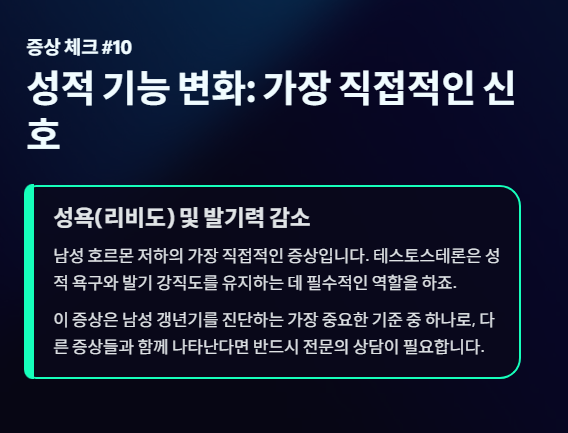 - 10번(성욕/발기력 감소)을 포함하여 총 3가지 이상의 증상에 해당된다면, 남성 갱년기일 가능성이 높습니다.