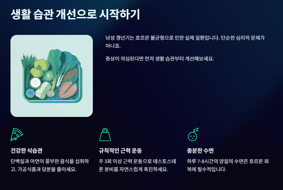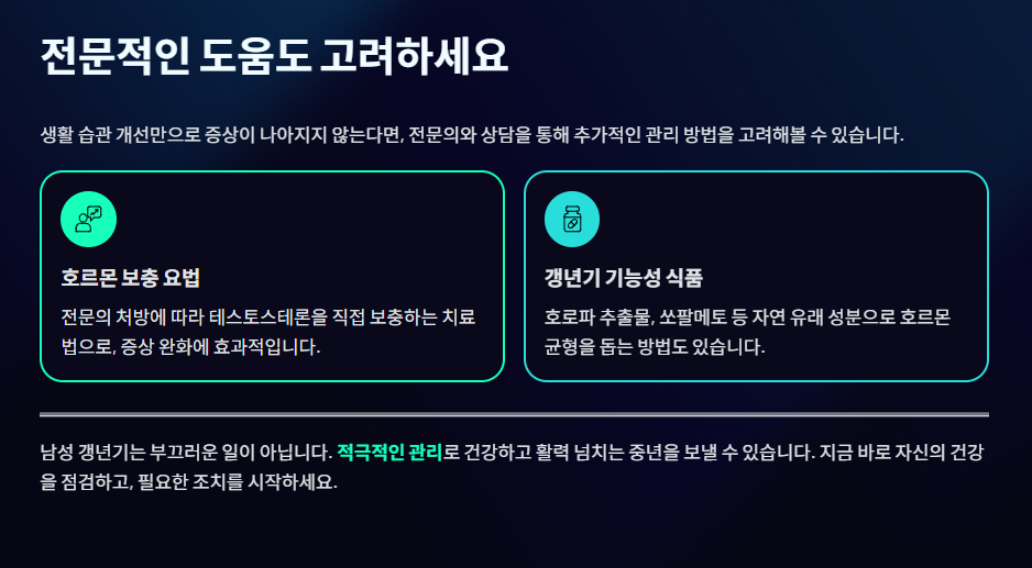 남성 갱년기는 단순한 심리적 문제가 아닌 호르몬 불균형으로 인한 실제 질환입니다. 만약 잦은 피로, 근육 감소, 성 기능 저하 등 갱년기 증상이 의심된다면, 건강한 식습관, 규칙적인 근력 운동, 충분한 수면을 통해 생활 습관을 개선하고, 필요하다면 전문의와의 상담을 통해 호르몬 보충 요법이나 **갱년기 기능성 식품(예: 호로파 추출물, 쏘팔메토 등)**의 도움을 받는 것이 중요합니다.