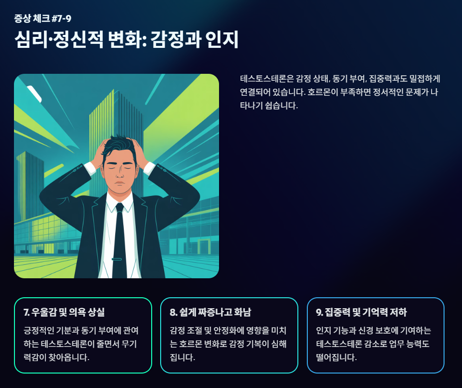 테스토스테론은 감정 상태, 동기 부여, 집중력과도 밀접하게 연결되어 있어, 부족하면 정서적인 문제가 나타나기 쉽습니다.