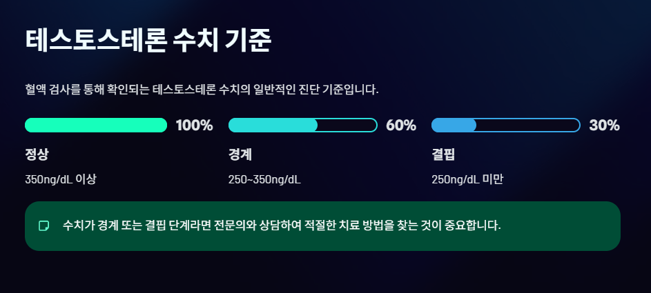 - 테스토스테론 수치 기준 (일반적인 진단 참고):