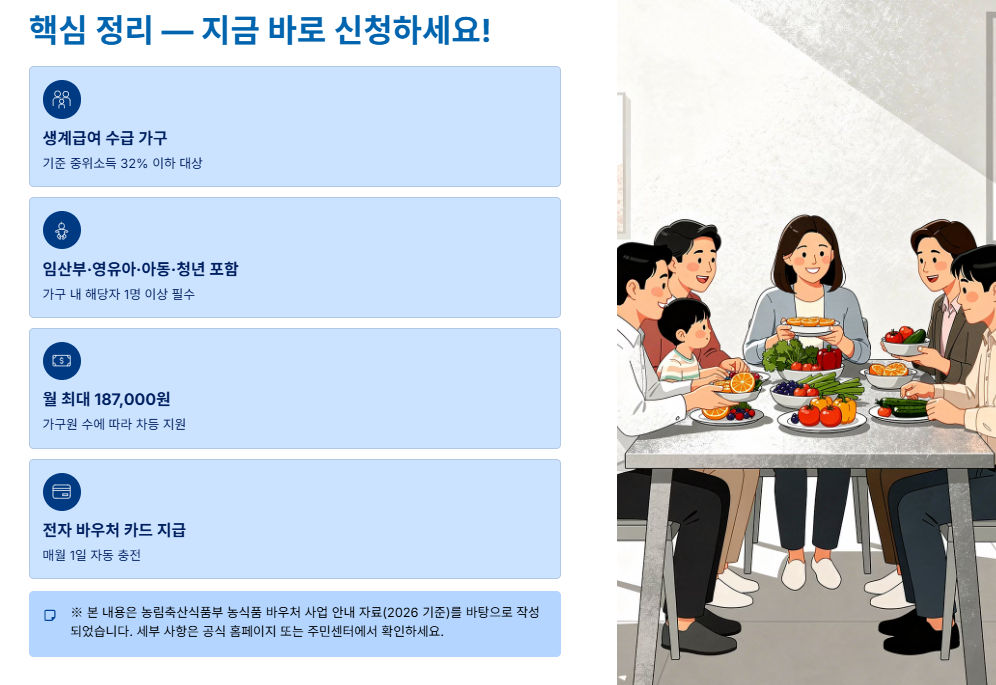 농식품 바우처를 받을 수 있는 조건 알고 계신가요? 많은 가구가 대상이지만 신청방법이나 기준을 몰라 혜택을 놓치고 있습니다. 2026년 기준 농식품 바우처 조건, 지원금액, 신청방법까지 한 번