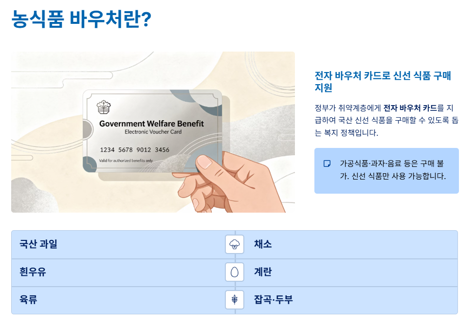 농식품 바우처는 취약계층의 식품 구매를 지원하는 정부 복지 정책입니다.