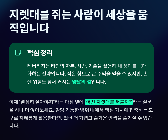 결국 레버리지란 **'내가 가진 자원(시간, 돈, 에너지)을 가장 가치 있는 곳에 집중하기 위해 다른 도구들을 활용하는 지혜'**입니다. 단순히 돈을 많이 벌기 위한 수단이 아니라, 내 삶의 주도권을 되찾아 내가 진짜 하고 싶은 일에 시간을 쓰기 위한 전략인 셈이죠.