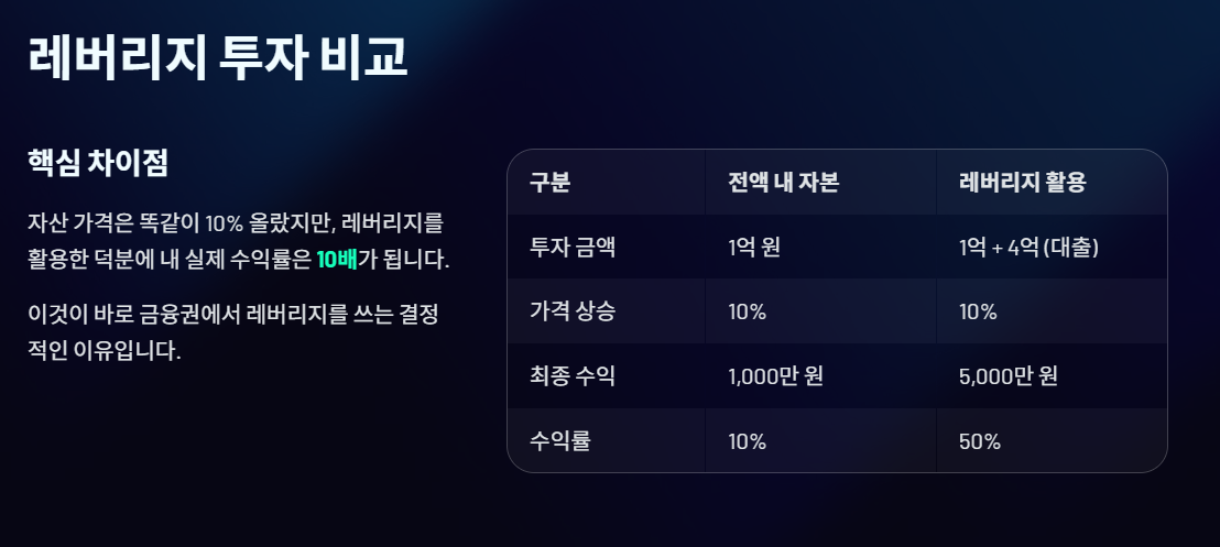 보이시나요? 자산 가격은 똑같이 10% 올랐지만, 레버리지를 활용한 덕분에 내 실제 수익률은 10배가 되었습니다. 이것이 바로 금융권에서 레버리지를 쓰는 결정적인 이유입니다.