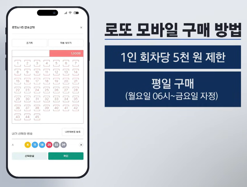 로또 모바일 구매는 동행복권 공식 홈페이지에서만 가능합니다. 만 19세 이상 본인 인증 후 예치금 충전→번호 선택→구매 순서로 진행되며, 구매 한도·시간·당첨금 수령 방법까지 한 번에 정리했습니다.