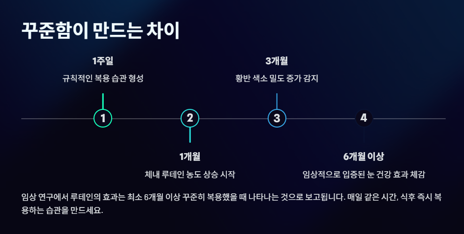 • 복용 원칙: 간헐적인 복용보다는 매일 일정한 시간에 꾸준히 섭취하는 것이 혈중 농도를 일정하게 유지하고 황반 색소 밀도를 높이는 데 결정적입니다. 임상 연구에서도 루테인의 효과는 최소 6개월 이상 꾸준히 복용했을 때 나타나는 것으로 보고됩니다.