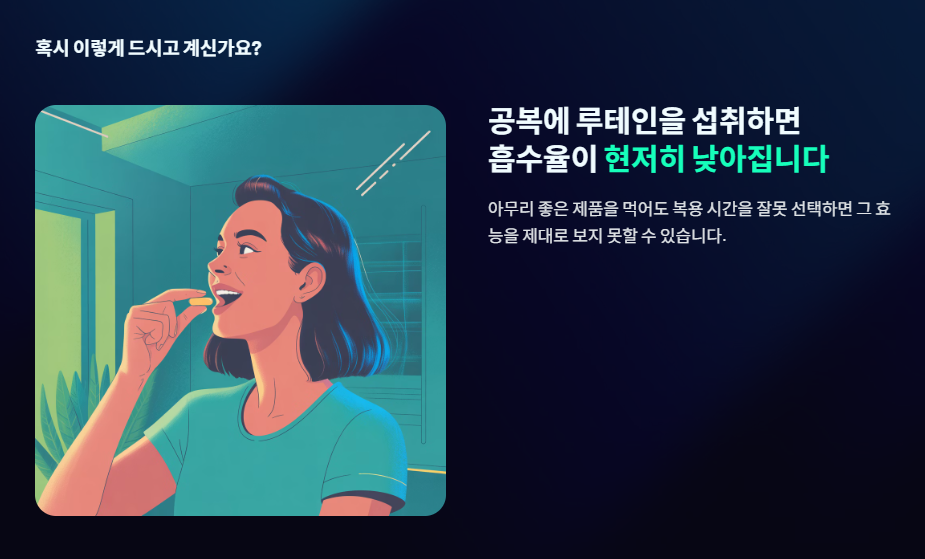 • 공복 복용 금지: 공복에 루테인을 섭취하면 흡수율이 현저히 낮아지거나 거의 흡수되지 않을 수 있습니다.