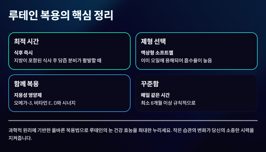 루테인의 최적 복용 시간은 지방이 포함된 식사 후 즉시이며, 이는 루테인(지용성)이 지방의 도움을 받아야만 흡수될 수 있는 과학적 원리 때문입니다. 오메가-3 등 다른 지용성 영양제와 함께 액상형 캡슐로 꾸준히 섭취하는 것이 루테인의 눈 건강 효능을 가장 확실하게 체감하는 방법입니다.
