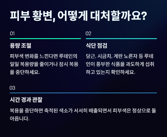 - 용량 조절: 피부색 변화를 느낀다면 복용하는 루테인/지아잔틴의 일일 용량을 줄이거나 잠시 복용을 중단하세요.