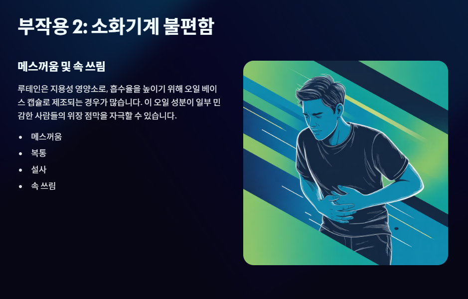 - 지용성 제형: 루테인은 흡수율을 높이기 위해 오일(홍화씨유, 올리브유 등)에 녹여 소프트젤 형태로 만듭니다. 이 오일 베이스 캡슐이 일부 민감한 사람들의 위장 점막을 자극하여 메스꺼움, 복통, 설사 등의 불편함을 유발할 수 있습니다.