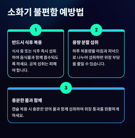 - 용량 분할: 하루 복용량을 아침/저녁으로 나누어 섭취하는 것도 도움이 될 수 있습니다.